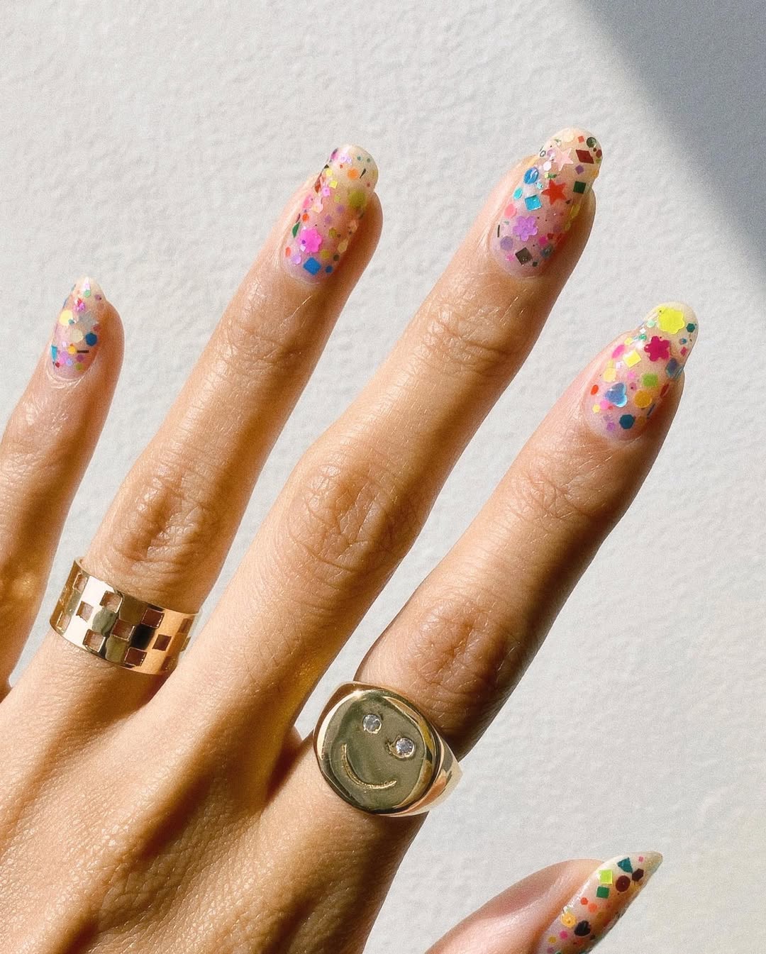 A paleta de cores explorava os extremos: tons pastel ácidos se misturavam com neons vibrantes e metálicos chamativos. O design era igualmente criativo, com a presença de smileys, estrelas, poás e desenhos geométricos que surgiam ao lado de francesinhas invertidas e acabamentos holográficos extravagantes. Entre o minimalismo e o maximalismo, cada manicure refletia a liberdade estética da época.