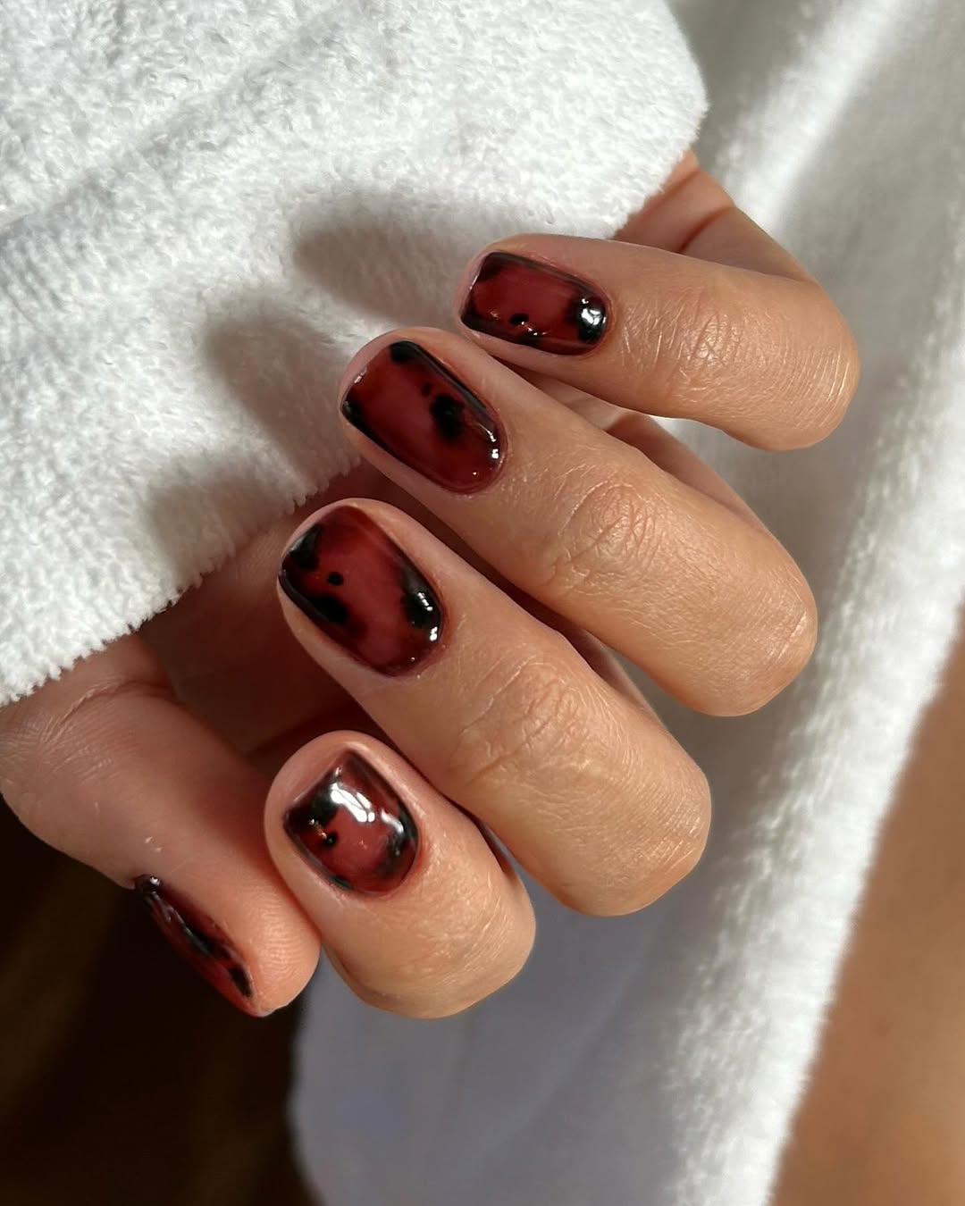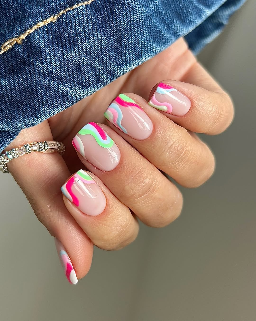 Também chamam atenção os desenhos com padronagens retrô, como estrelas tie-dye, estampas de animal print e bolinhas, que aparecem de forma mais delicada e moderna. Ao lado delas, aparecem unhas com designs abstratos e geométricos, além da estética “Pantone”, onde cada unha exibe uma cor diferente da paleta. Essa variedade de inspirações destaca a versatilidade do revival e permite que cada pessoa personalize a tendência de acordo com seu estilo único.