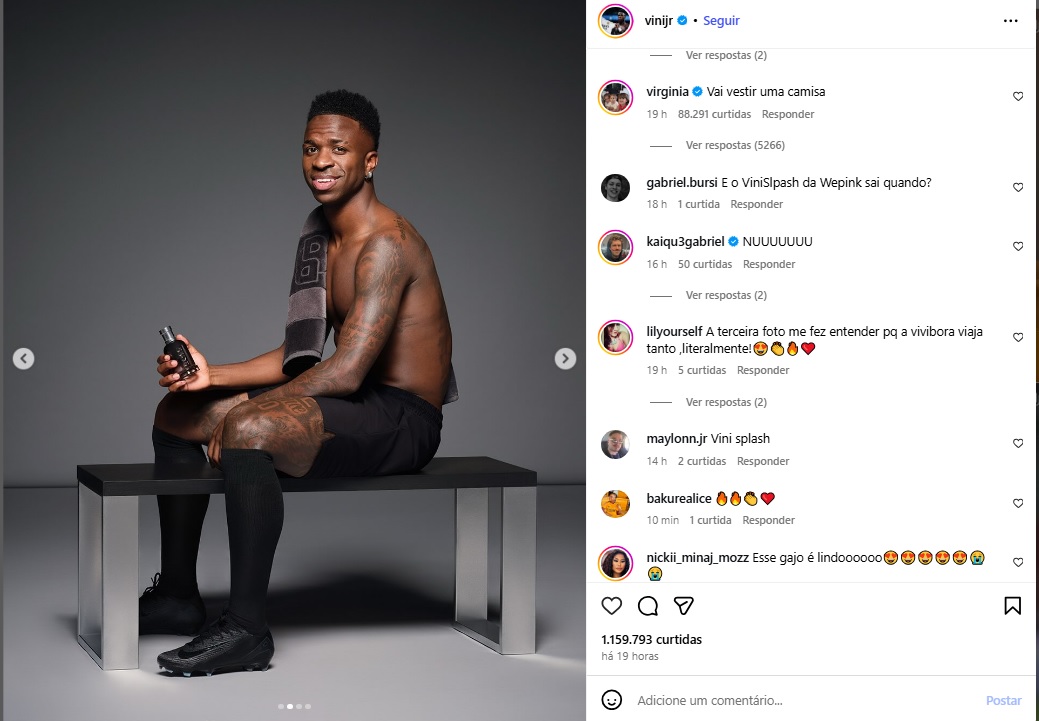 Nas redes sociais, um episódio envolvendo o casal também ganhou destaque. Virginia reagiu a uma imagem postada por Vini Jr., na qual o jogador surge sem camisa em campanha de perfume. A apresentadora comentou em tom leve, pedindo que ele “vestisse algo”, provocando respostas bem-humoradas dos fãs, que acompanharam a publicação atentamente naquele momento.