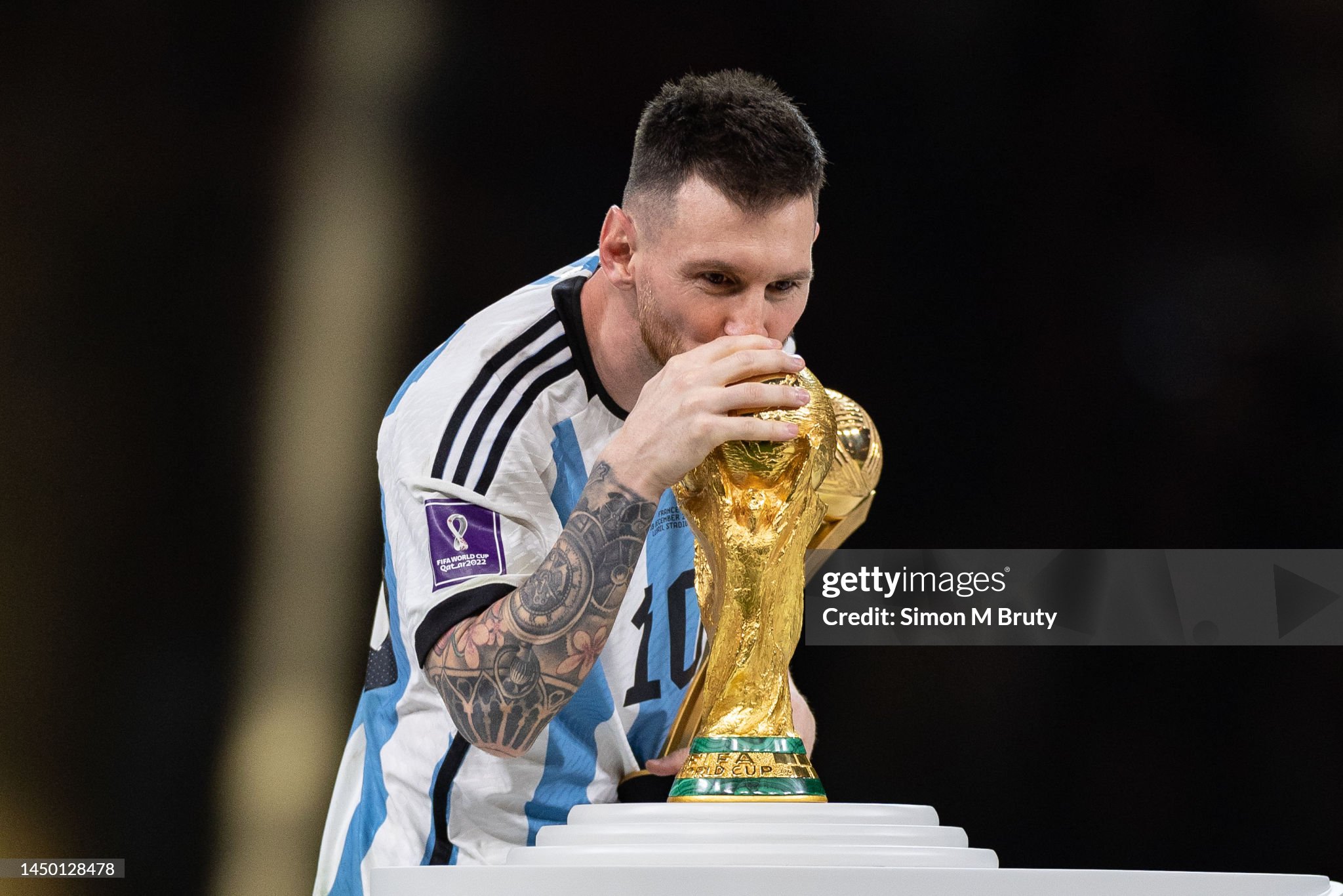 Lionel Messi beija a taça da Copa do Mundo, em 2022 (Foto: reprodução/Simon M Bruty/Getty Images Embed)