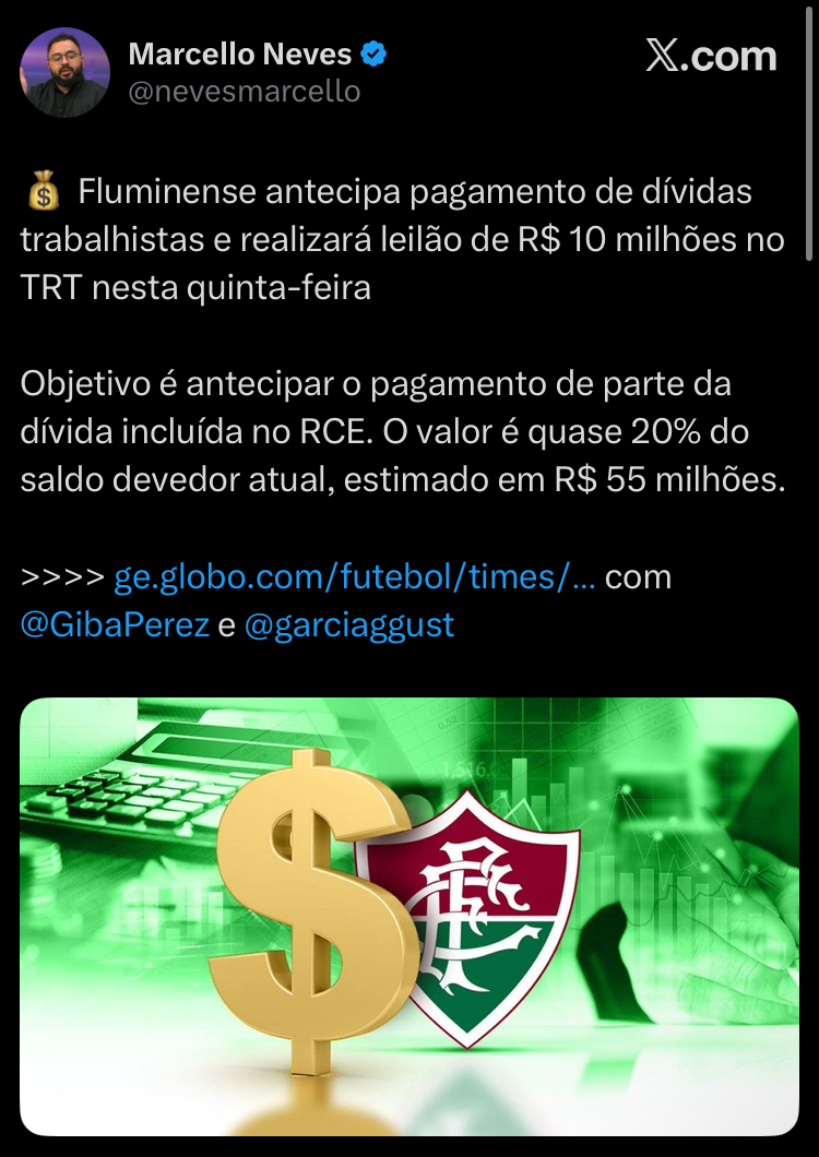 Imagem de matéria sobre leilão do Fluminense (Foto: reprodução/x/@nevesmarcello)