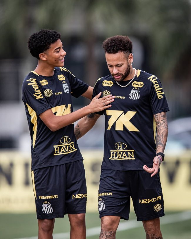 Neymar ao lado de Robinho Jr. no CT Rei Pelé, em Santos (reprodução/Raul Baretta)