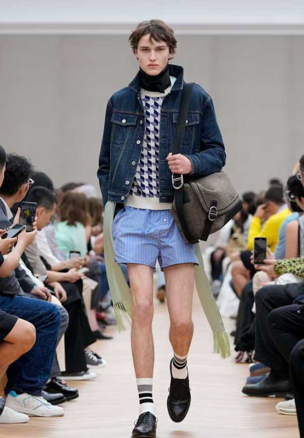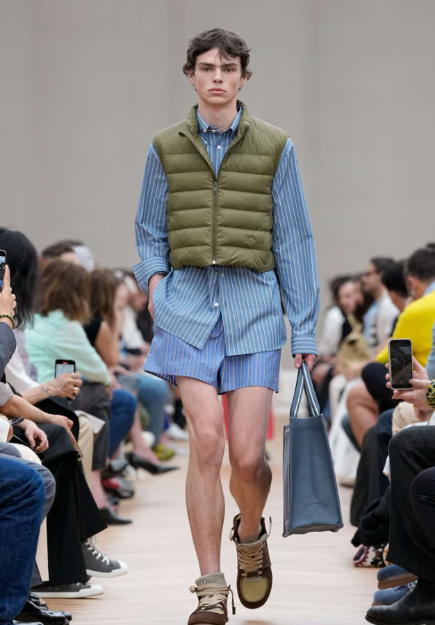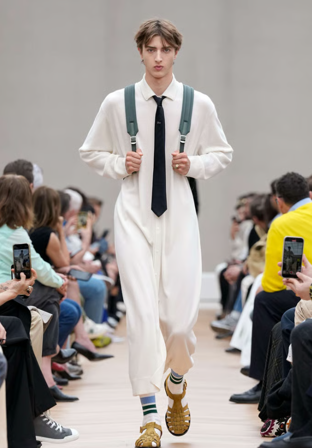 Enquanto o traje revisitava peças icônicas como a barra, a alfaiataria eduardiana ou o short delft, os acessórios ancoravam o discurso visual, sem mais precisos. A bolsa masculina deixa de ser um tabu ou nicho e torna-se o centro da esfera masculina, manuseada, elegante e universal.