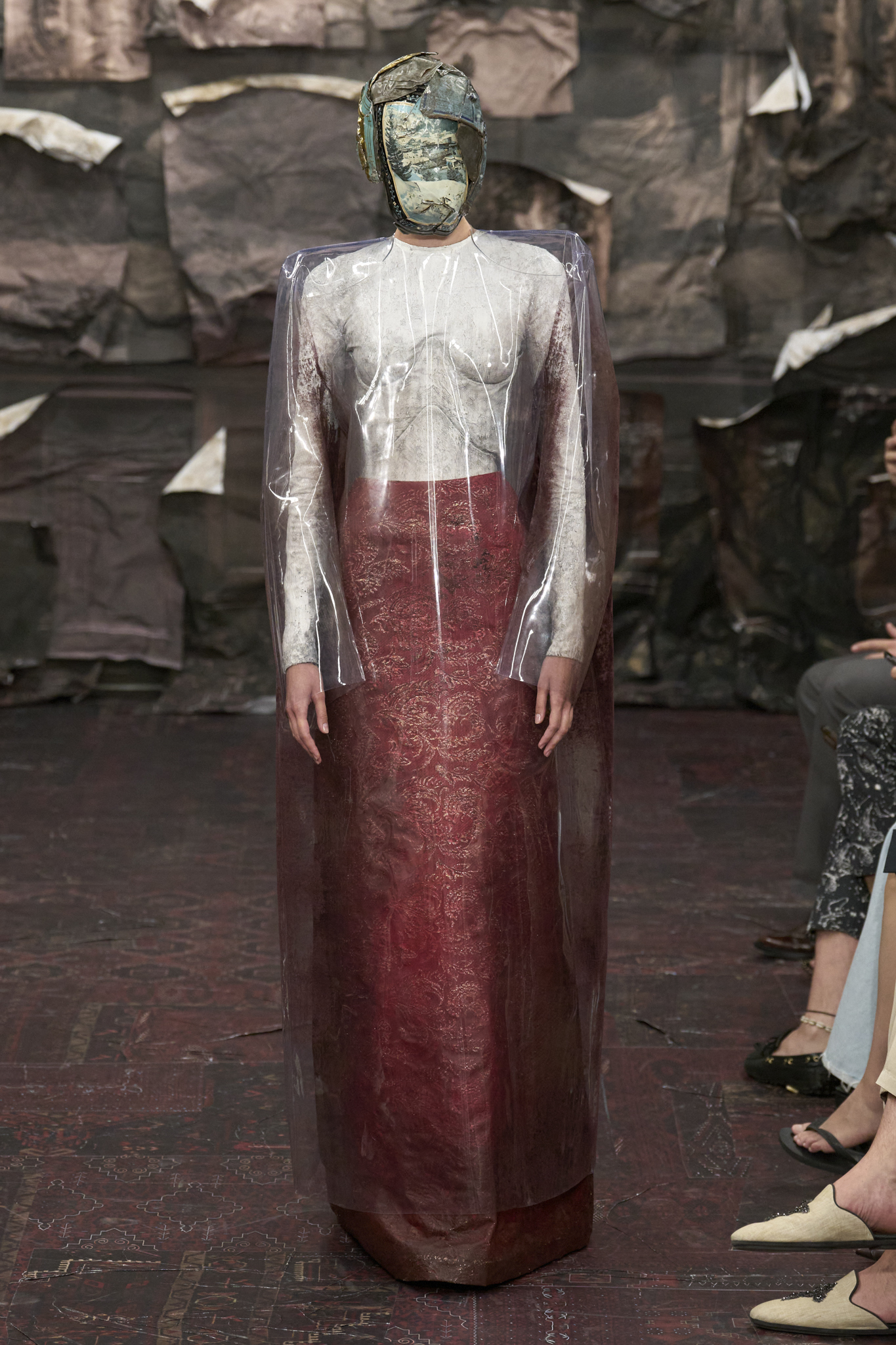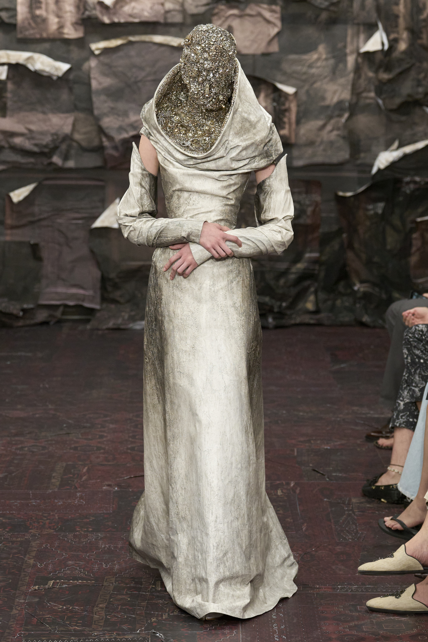 Outro elemento marcante foi o uso de coberturas faciais nas modelos — referência direta à estética desenvolvida por Margiela e inspirada em Greta Garbo, pensada para manter o foco nas roupas e preservar o anonimato das modelos.