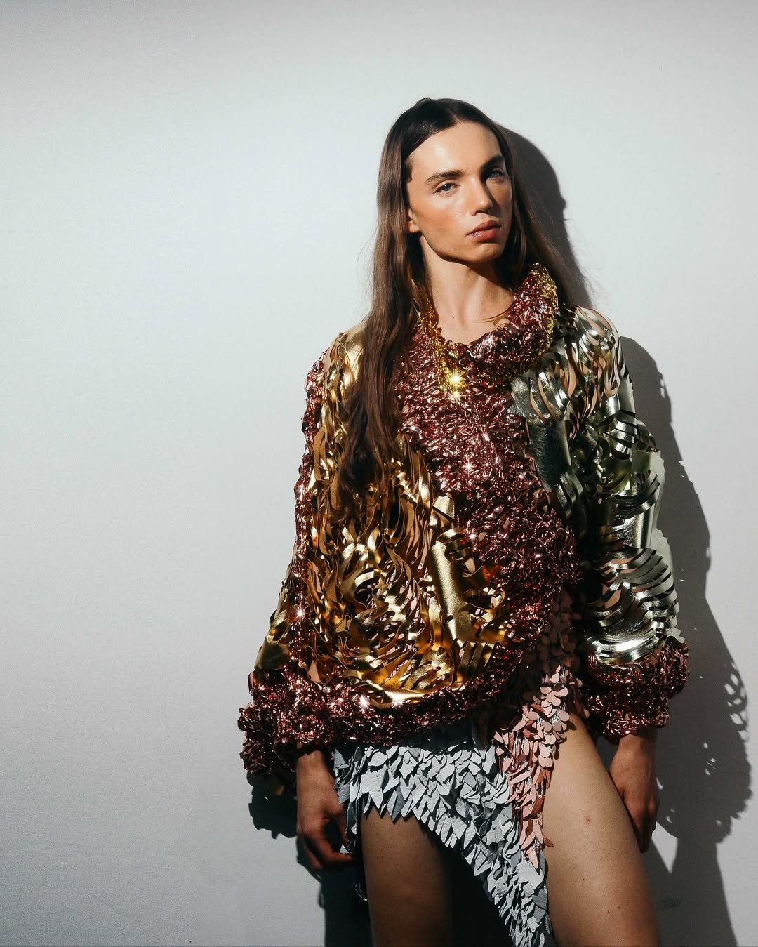 Modelo usa modelito de paetê e peças metálicas de Gustavo Silvestre (Foto: reprodução\Instagram\@feliperufinno)