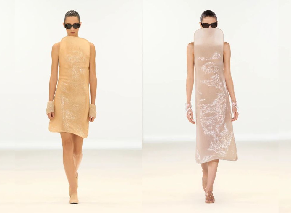 Na Courrèges, Di Felice usou paetês em vestidos de jersey e seda feitos de frames de sombrinhas de sol, culminando em acessórios metálicos que pareciam rebatedores de calor. É o brilho não apenas como decoração, mas como um elemento de design que passa uma mensagem figurada.