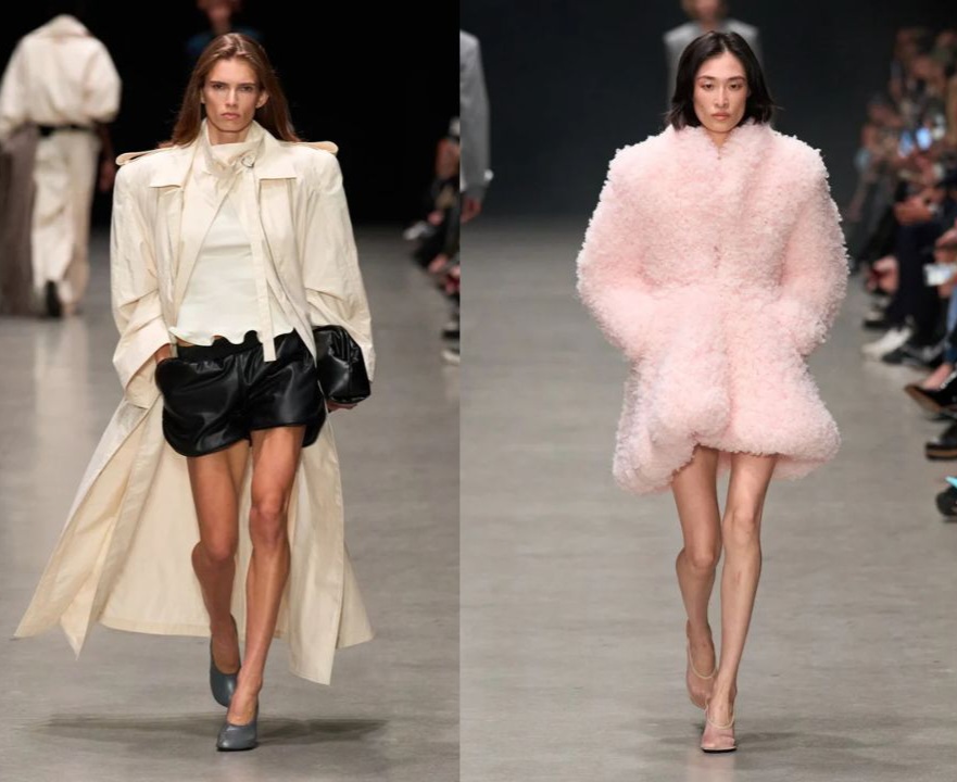 Na Stella McCartney, a peça ganhou proporções monumentais e oversized. A marca explorou tecidos poplin e versões fuzzy (peludas) que, apesar do peso visual, são feitos para transições climáticas com consciência ecológica.