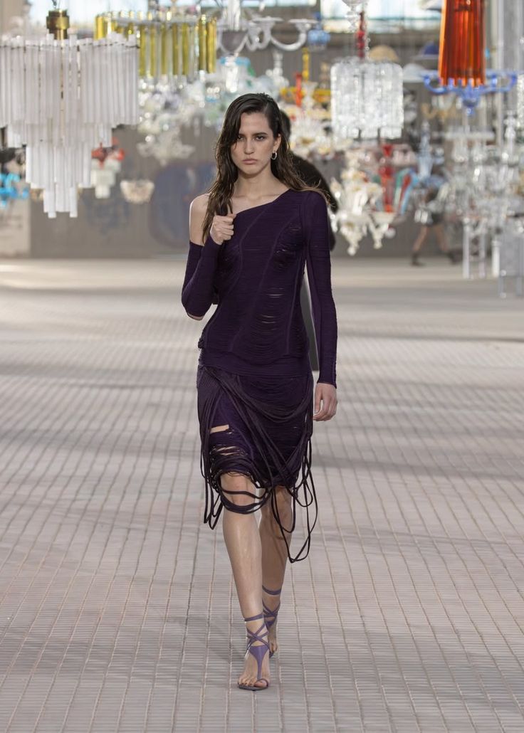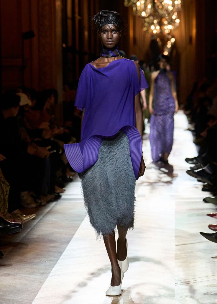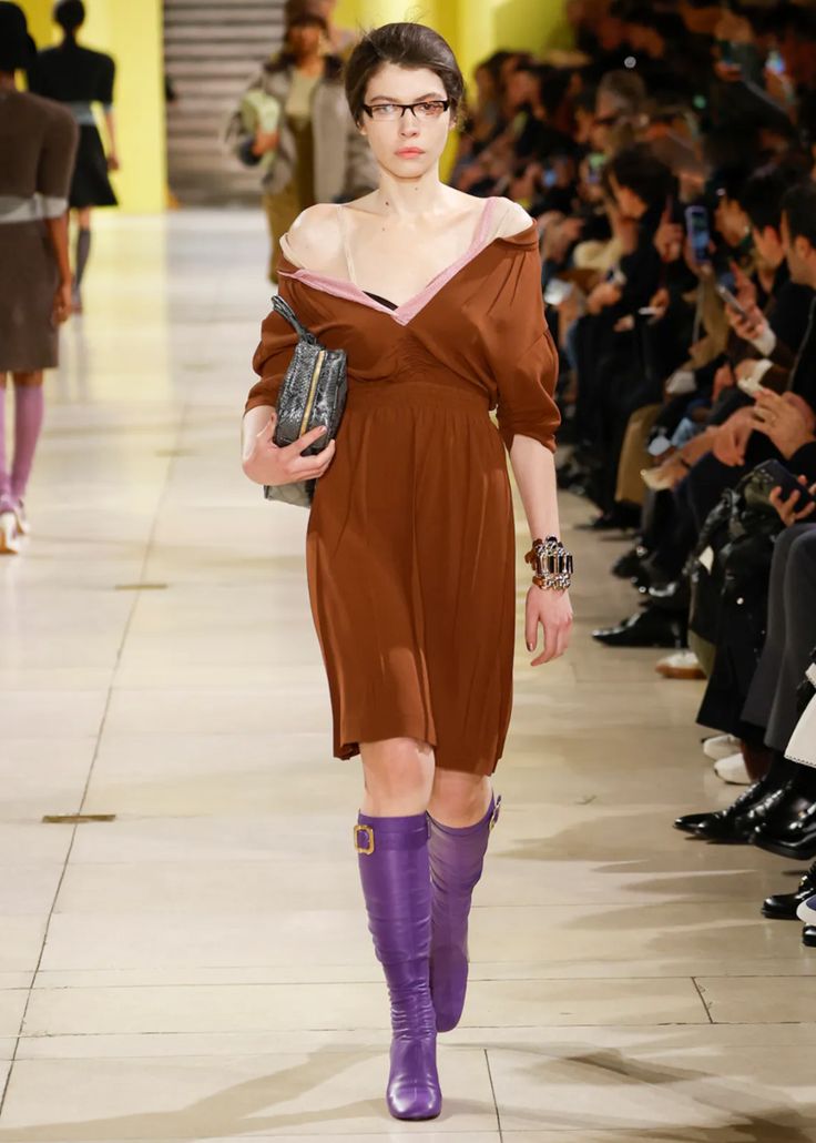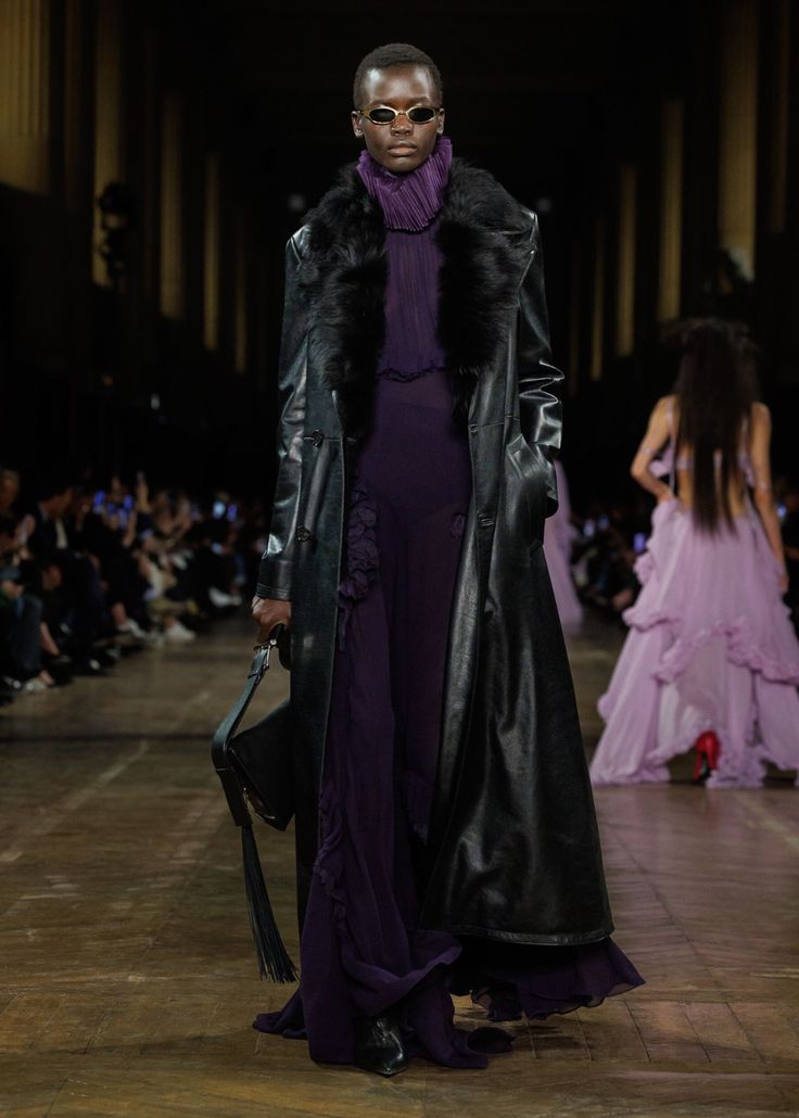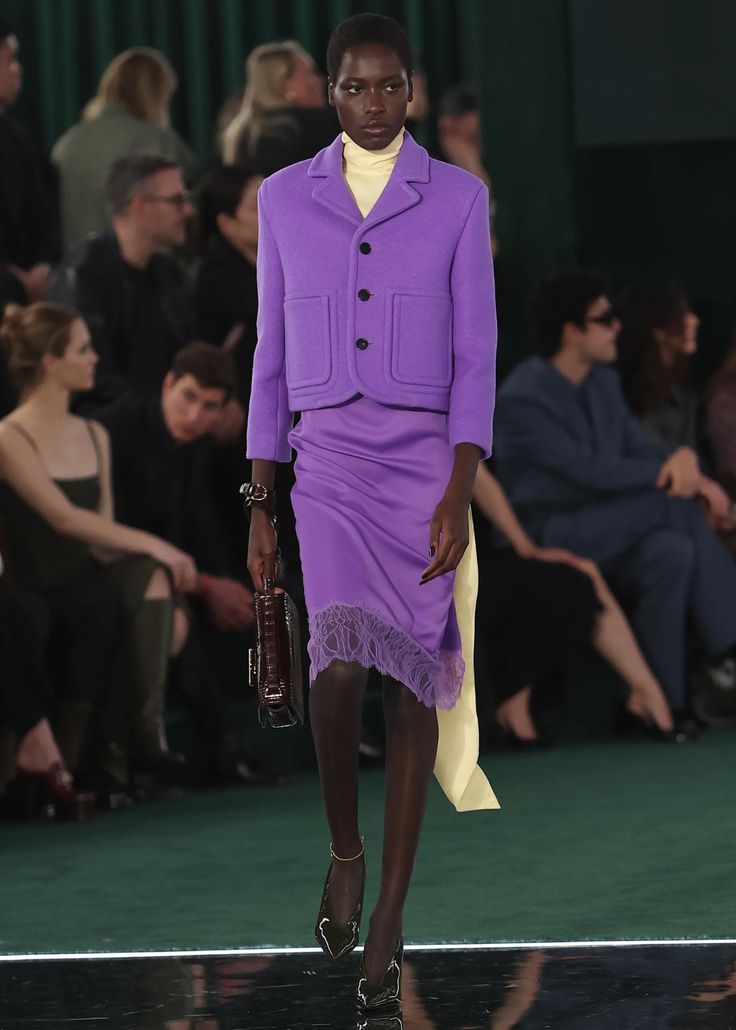 A tendência ganhou força nos desfiles internacionais. A Dries Van Noten trouxe composições monocromáticas com lavanda e cinza, na Gucci, o roxo neon se destacou em peças de alfaiataria modernizadas, já na McQueen, a estética vitoriana foi repaginada com vestidos fluidos, casacos pesados e botas robustas, todos com presença forte da cor, na The Attico, o look ton sur ton combinou lavanda nos pés com roxo profundo no corpo.