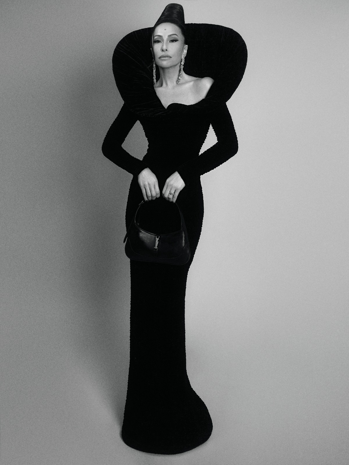 Com uma produção que traduz a força estética e a dramaturgia da coleção, Sabrina escolheu um vestido preto que valoriza as curvas do corpo e se destaca pela gola escultural, lembrando uma verdadeira obra de arte.