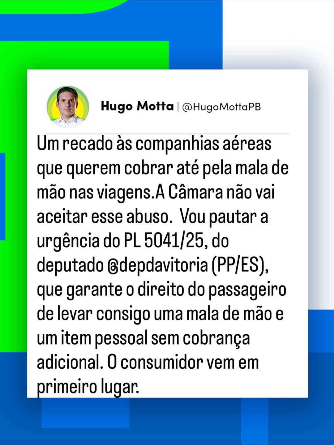 O presidente da Câmara, Hugo Motta (Republicanos-PB), classificou a cobrança pela mala de mão como um exagero das companhias aéreas.