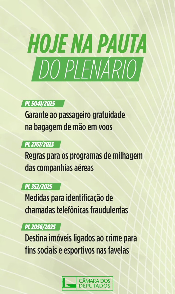 A Câmara dos Deputados aprovou nesta terça-feira (21) a tramitação em regime de urgência de um projeto que proíbe as companhias aéreas de cobrarem pela bagagem de mão. A proposta assegura ao passageiro o direito de levar gratuitamente uma mala de cabine e um item pessoal, como bolsa ou mochila, respeitando os limites de peso e dimensões definidos pela Agência Nacional de Aviação Civil (Anac). Com a urgência aprovada, o texto poderá ser votado diretamente no plenário nos próximos dias.
