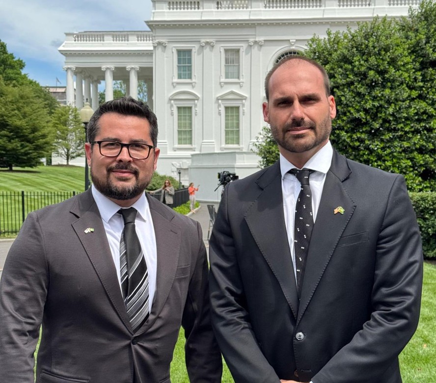 Paulo Figueiredo e Eduardo Bolsonaro em frente a Casa Branca (reprodução/X/@rogeriotomazjr)