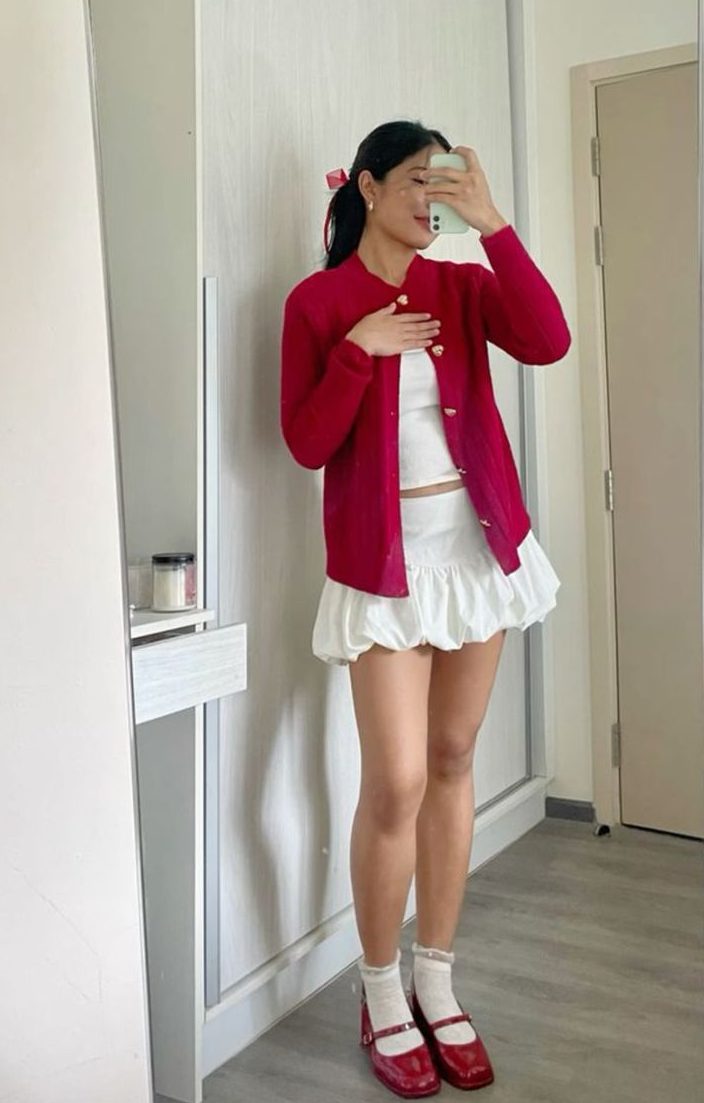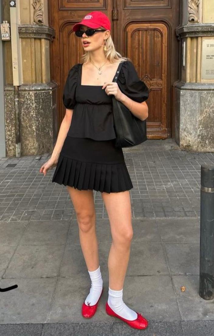 Uma das combinações em alta é atualmente a mistura de vermelho com rosa — referência direta ao estilo coquette girl, que domina as redes sociais. Nessa proposta, os detalhes fazem toda a diferença: laços, babados, meias texturizadas e sapatilhas com fivelas trazem ainda mais charme à composição. Finalize o look com acessórios delicados e uma bolsa espaçosa, perfeita para aquele passeio em uma cafeteria instagramável.